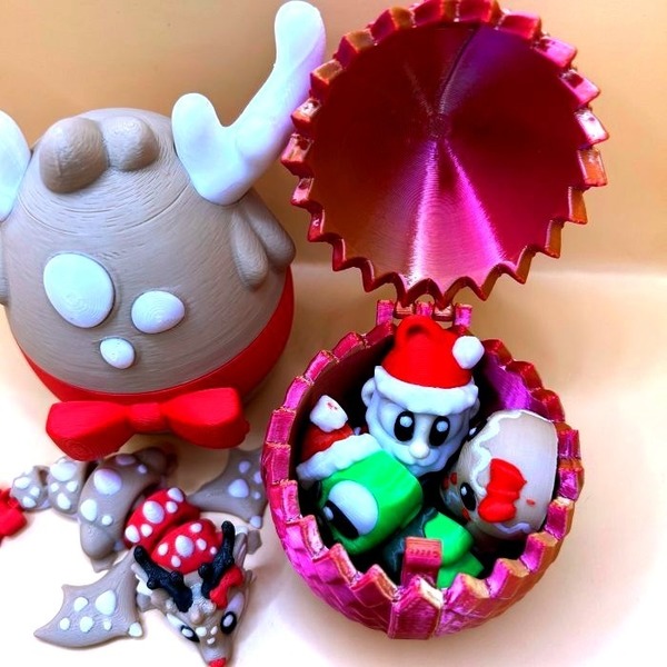 - Christmas Dragon – a playful reindeer dragon with cosy antlers and a bright red bow on his tail. He arrives tucked inside his very own reindeer egg, ready to dash, dance, and spread Christmas cheer.