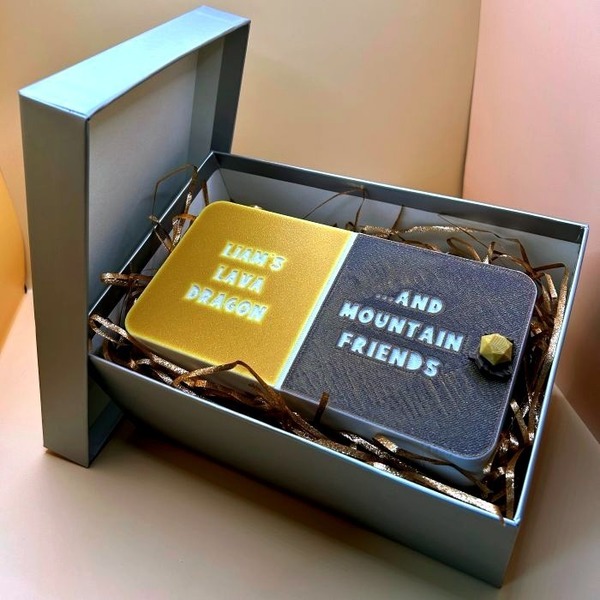 Both eggs come in a sturdy two-compartment box that doubles as a mountain cave or play world, ready for hours of imagination. Each lid is custom-engraved with the child’s name — like “Liam’s Lava Dragon & Mountain Friends.”